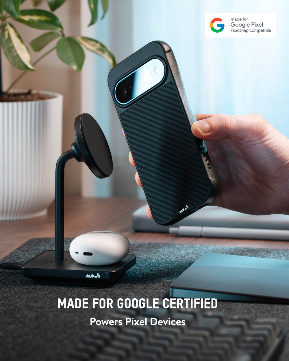 This stand is Made for Google certified, meaning it meets Google's standards for safety, quality and performance with Pixel devices. However, it’s also fully universal – working seamlessly with Qi2-enabled devices like iPhone as well as Android devices and older Pixels in Mous MagSafe® compatible cases for reliable snap-on charging.