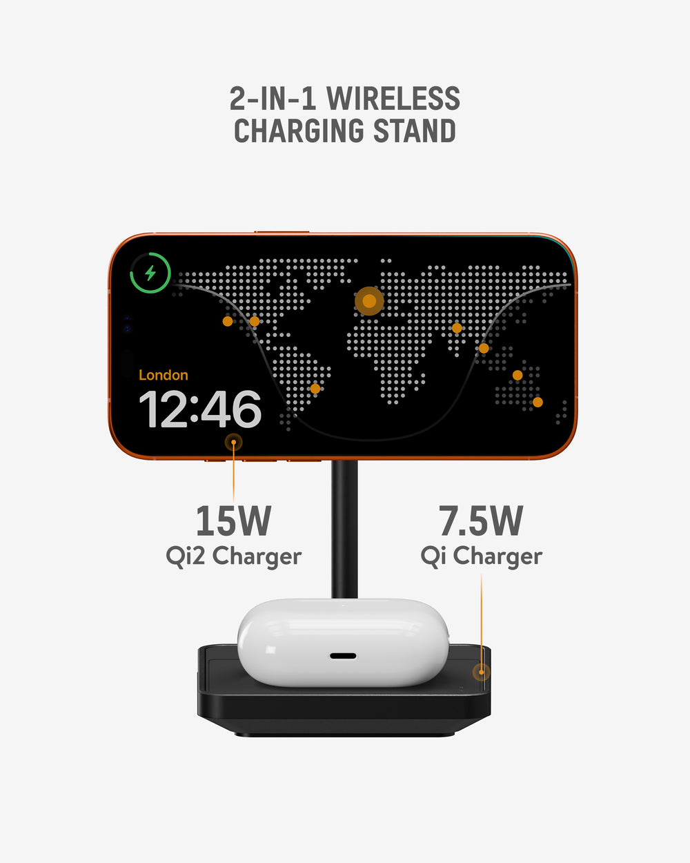 It delivers up to 15W for Qi2-enabled and MagSafe® compatible devices, including iPhone 17 and Pixel 10. The base Qi coil powers secondary devices like earbuds at up to 7.5W or 5W depending on compatibility.