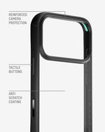 Clarity is our most protective clear case. Corner-focused AiroShock® cushions key impact zones while a rigid PCTG co-polyester body resists flex and torsion. A reinforced camera ring made from glass-filled polycarbonate and strategically raised edges add extra defence for your lenses and screen.