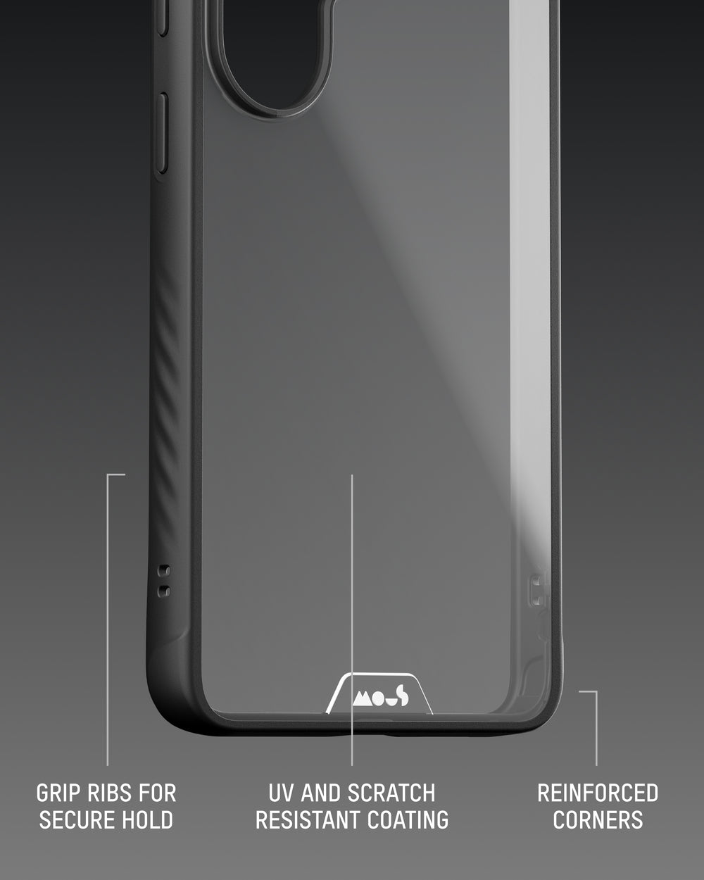 The primary material forming the body of the case. A rigid, crystal-clear thermoplastic chosen for its strength, impact resistance and ability to maintain long-term clarity. It provides the core structural integrity of Clarity while resisting stress and maintaining transparency over time.