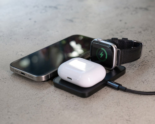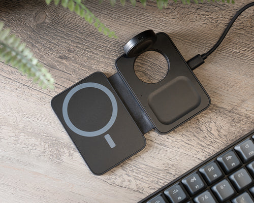 A super-light and compact portable charger for wirelessly charging three devices at the same time. Features a MagSafe® compatible charging module, an Apple Watch charging module and a wireless earbuds charging module.