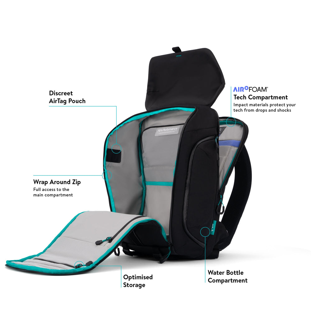 • 18 purpose-built pockets, including stretch mesh, quick-access, hidden AirTag and water bottle holder.