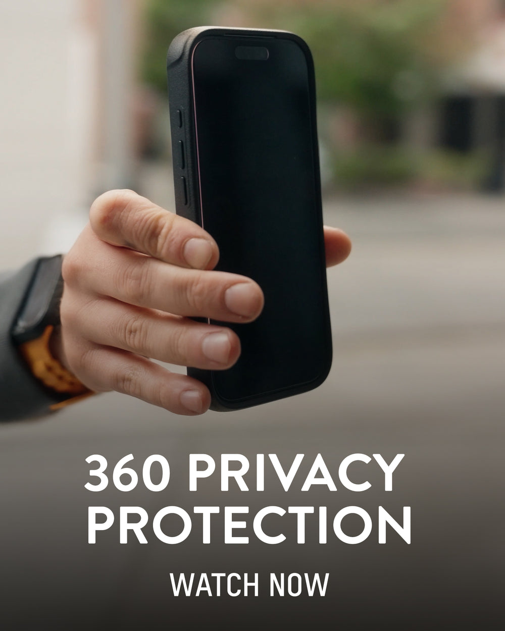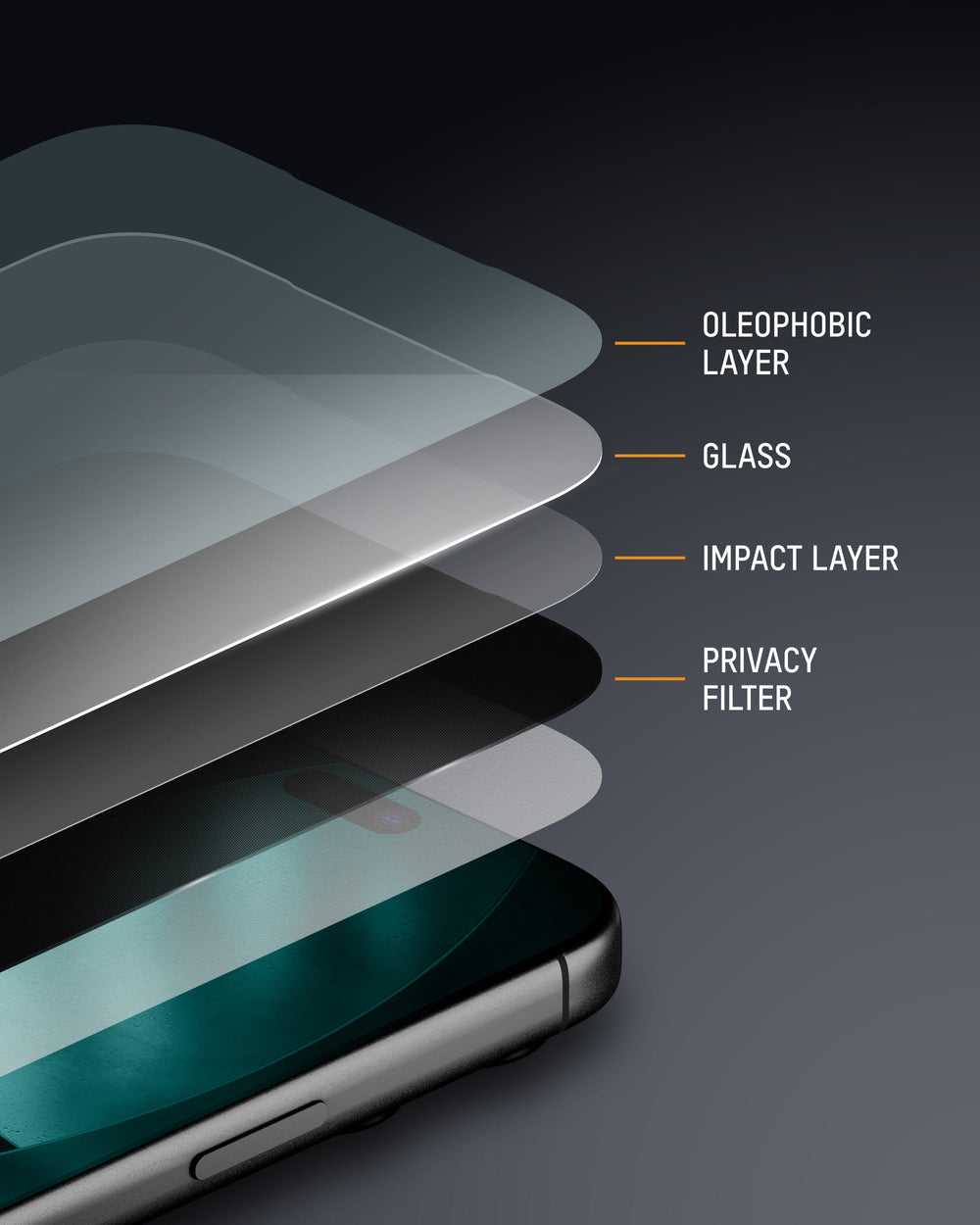 Privacy screen protector with 360° two-way filter, high-level scratch resistance and edge-to-edge coverage. Keeps your display clear to you but hidden from prying eyes.