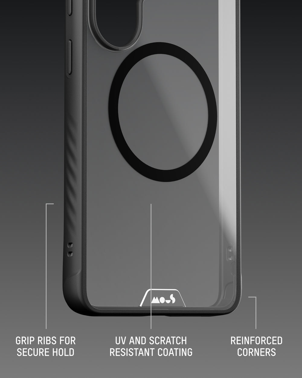 The primary material forming the body of the case. A rigid, crystal-clear thermoplastic chosen for its strength, impact resistance and ability to maintain long-term clarity. It provides the core structural integrity of Clarity while resisting stress and maintaining transparency over time.