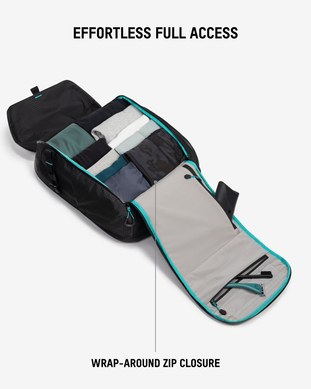• Wraparound zip opens wide for quick, convenient access to the main compartment.
