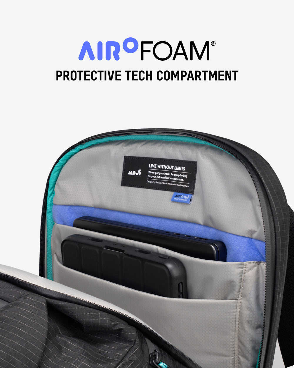 • Protective tech compartment with AiroFoam® absorbs shock from drops.