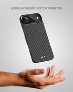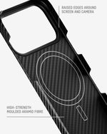 Our thinnest case, moulded from aramid fibre for everyday durability with a seriously slim profile, strategic cut‑outs for unhindered button access and full MagSafe®/Qi2 compatibility.