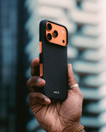 Our thinnest case, moulded from aramid fibre for everyday durability with a seriously slim profile, strategic cut‑outs for unhindered button access and full MagSafe®/Qi2 compatibility.