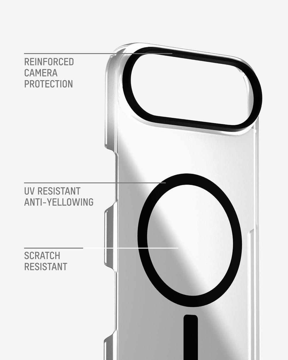 Our thinnest clear case, made from crystal‑clear polycarbonate with UV- and scratch‑resistant coatings. Includes cut‑outs for button access and full MagSafe®/Qi2 compatibility.