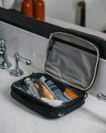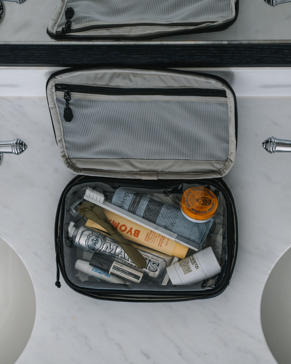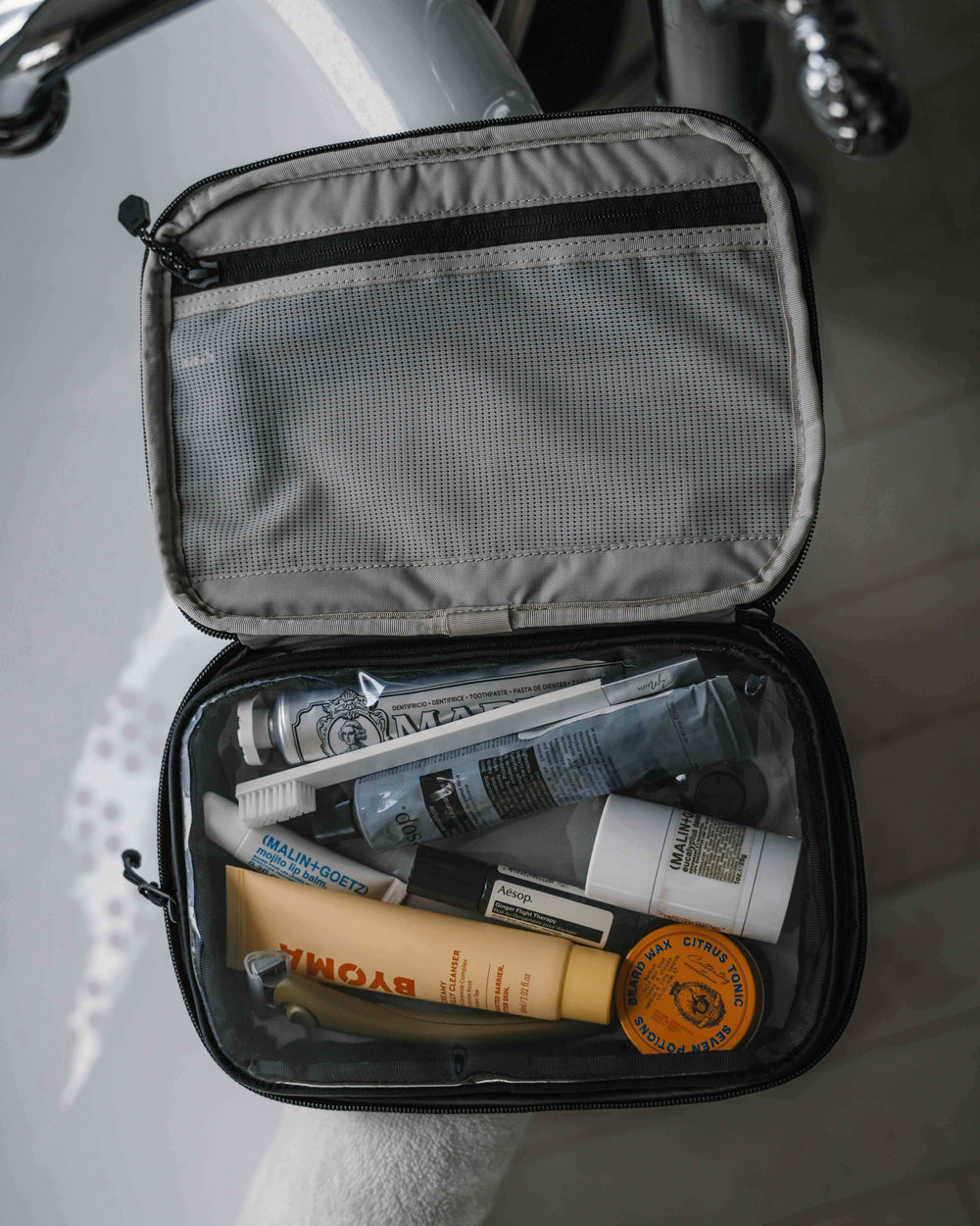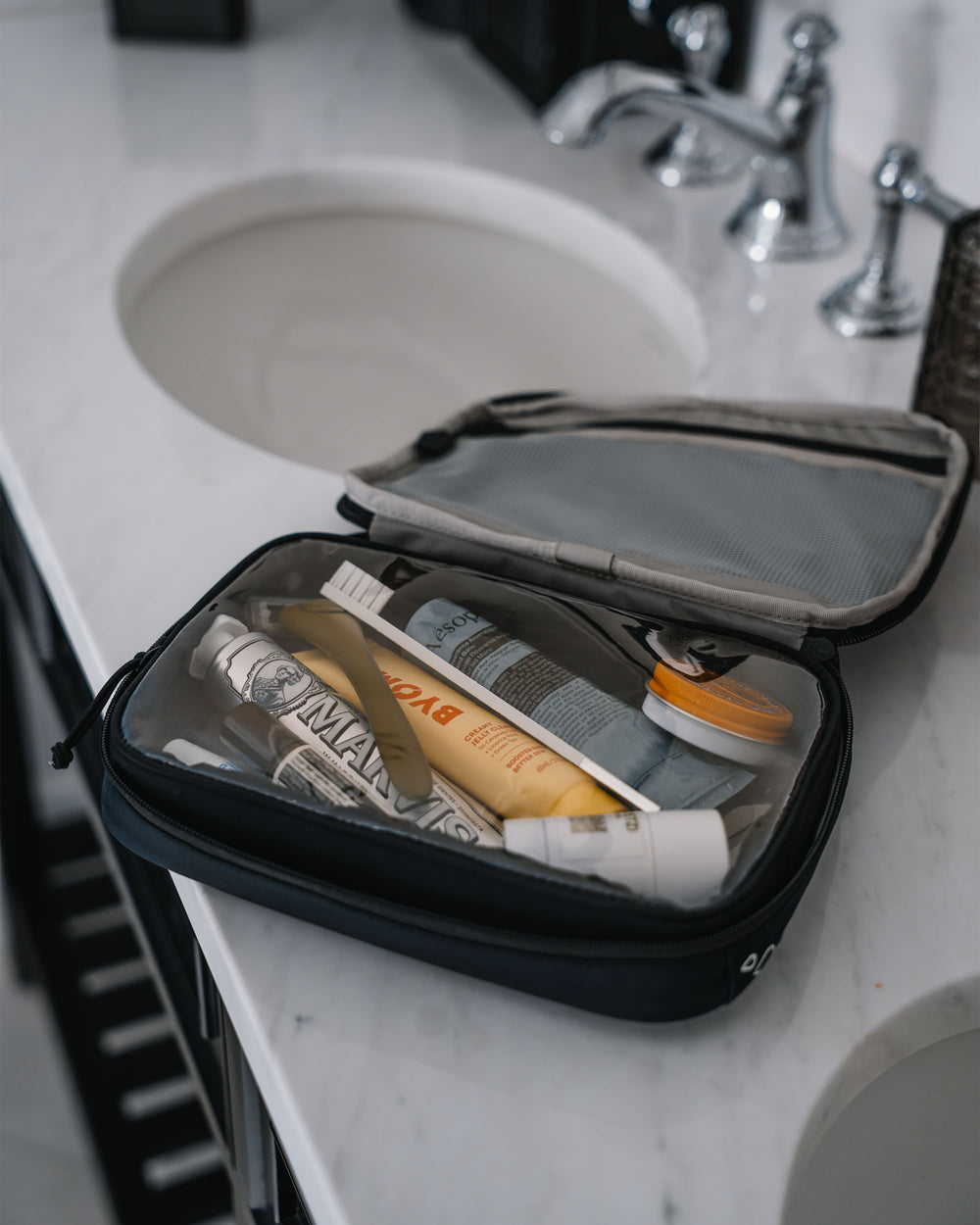 • This two-piece design includes a clear TSA-friendly pouch that magnetically attaches to the larger toiletry pouch for easy separation at airport security.