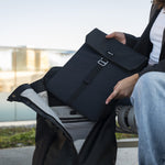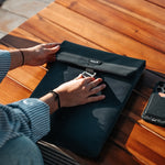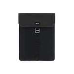 Made from recycled 420D nylon with PU-coated 600D polyester for the back and lid. The webbing is crafted from durable nylon. Inside, the sleeve features a soft lining and high-density padded foam. The G-hook hardware is made from aluminium and the rear slip pocket features a magnet.
