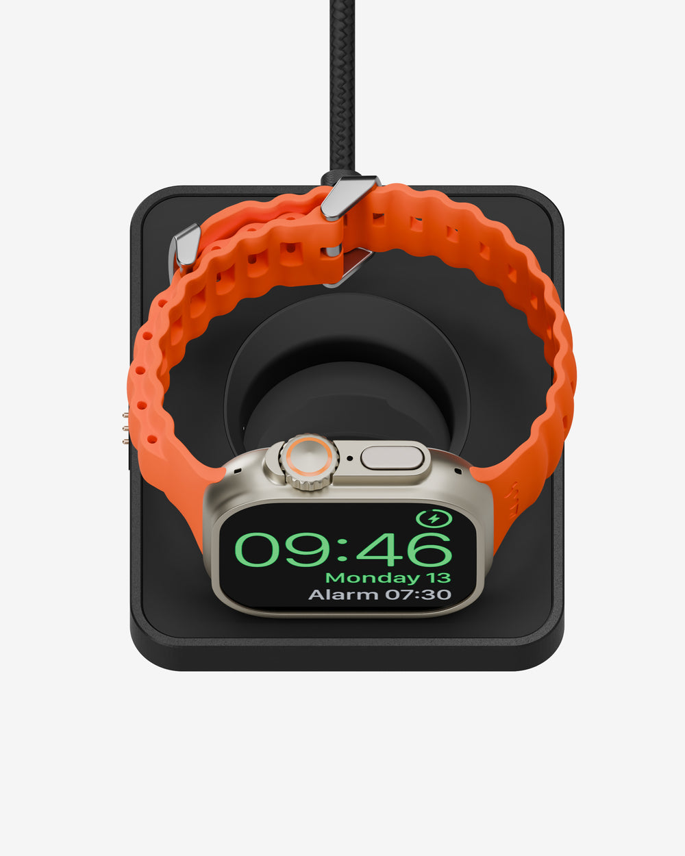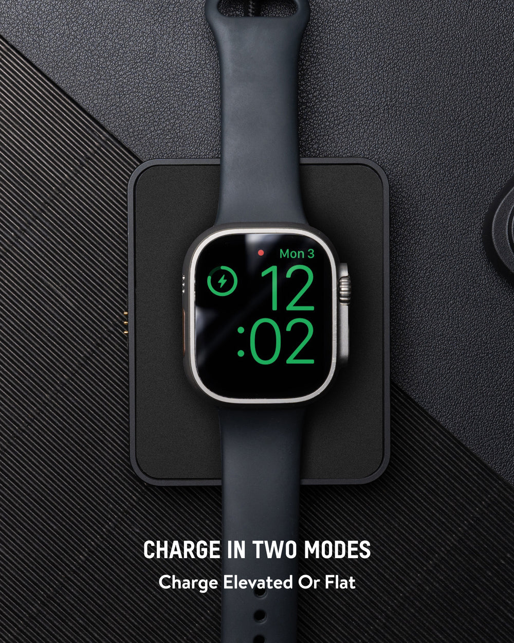 • Charge in two modes: flat or elevated. Enable Nightstand Mode on Apple Watch to turn it into a bedside clock when charging in the elevated position.