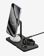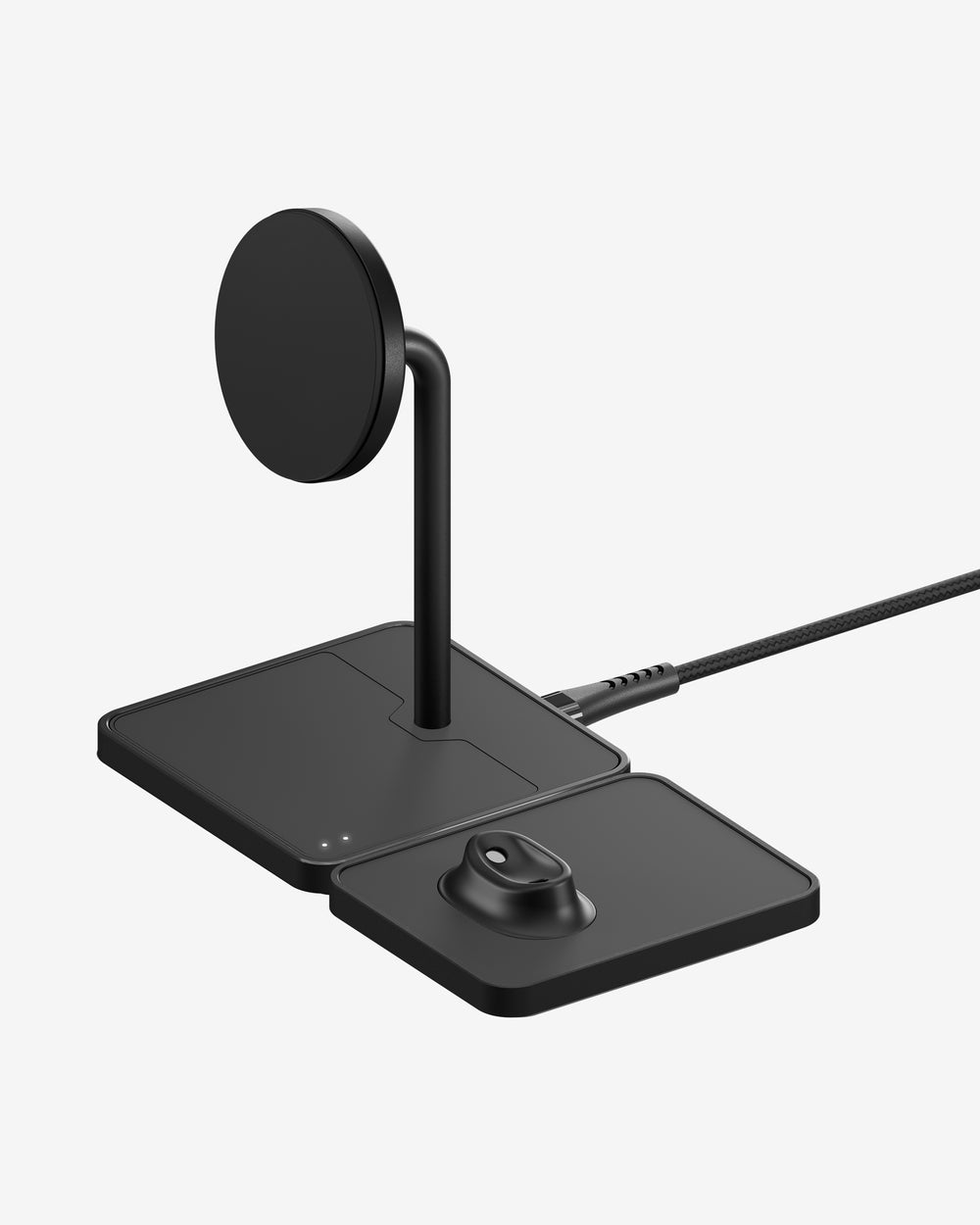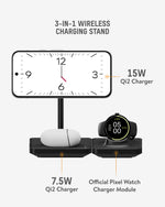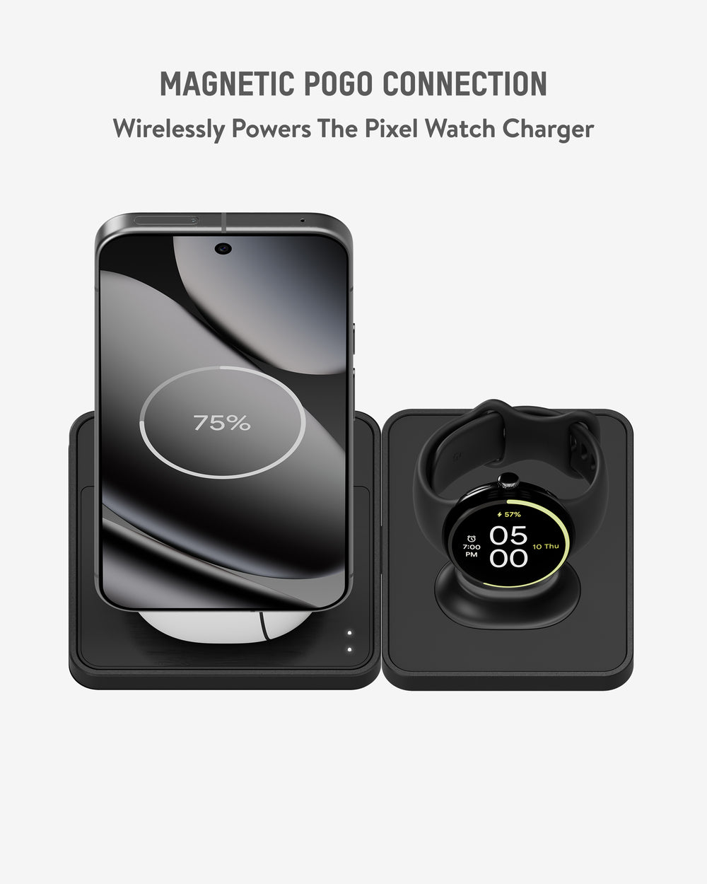 Yes. The Pixel Watch Charger magnetically connects to the stand’s pogo pins, creating a secure modular link that transfers power directly through magnetic contact. This allows both chargers to draw power from a single cable while the base Qi coil powers a third device such as earbuds.