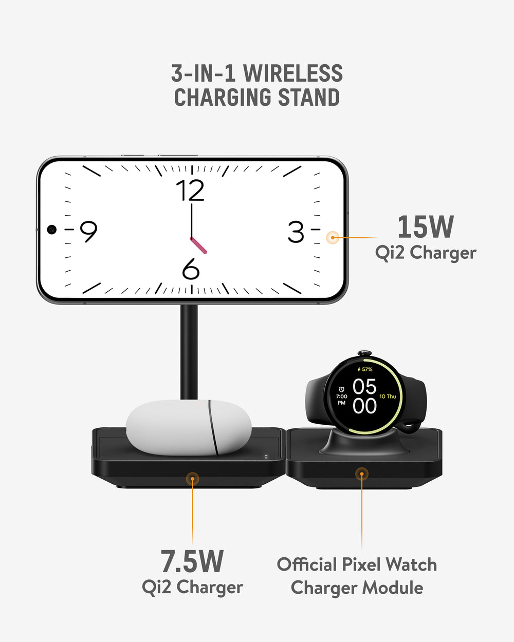 • Delivers up to 15W fast wireless charging for Qi2 and MagSafe® compatible phones and 5.6W contact charging for Pixel Watch 4.
