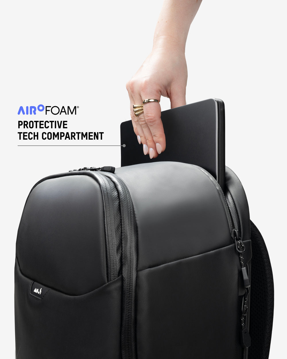 It features a dedicated rear tech compartment with AiroFoam® built into the base to absorb impact from drops and knocks. The sleeve is padded and softly lined to reduce pressure and prevent scuffs or scratches during daily carry.